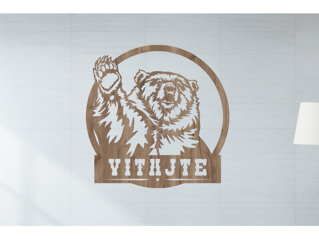 Drevený obraz vhodný na umiestnenie do vchodových priestorov ako netradičné uvítanie pre návštevníkov. Hlavným prvkom obrazu je detailná silueta medveďa so zdvihnutou labou, čo úsmevne vyzerá, akoby mával na ľudí. Všetko podtrhuje slovo VITAJTE umiestnené hneď pod ním. Jednoduchý, ale za to elegantný obraz, ktorý sa hodí ako do bytu, či domu, tak aj do reštaurácie alebo rôznych podnikov. Táto netradičná drevená "tabuľka" sa hodí nie aj do izby každého milovníka prírody a hôr ale aj ako netradičný darček pre známeho.