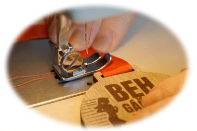 Na každú hotovú medailu ručne našívame stuhu podľa výberu zákazníka. To znamená, že každá jedna medaila „navštívi“ klasický šijací stroj, kde ju pekne usadíme a prišijeme na ňu stuhu. Výber farby a typu stuhy je opäť súčasťou individuálnej dohody. Dávame si záležať na tom, aby bola každá stuha pevne a esteticky pripevnená.